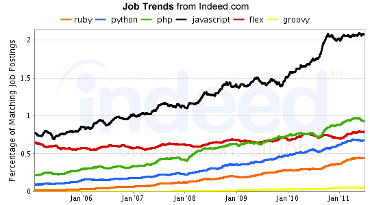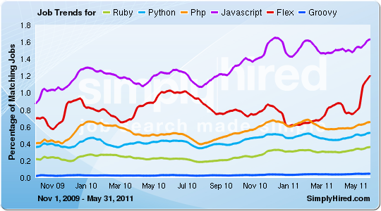同其它语言相比,JavaScript的需求量最大,但是在过去六个月里增长得较为缓慢。我预料到这样的趋势并不会持续下去,因为随着HTML5的广泛应用,我们越来越需要用到JavaScript的知识。总体而言,在过去的六个月里,所有的语言都表现出了更为缓慢的增长趋势。PHP先有一定幅度的增长,然后慢慢趋向稳定。而Python在下次更新之前似乎会赶超Flex。Ruby会继续保持增长的趋势,而Groovy则处于垫底低位,但一直保持着稳定的增长。