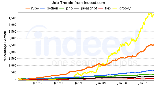 我很喜欢这张图,因为它显示的不仅仅是当前的需求,还有整个行业的动态。虽然目前整个行业对Groovy的需求量不是很大,但是同其它语言相比,它具有最强的增长趋势,紧跟其后的是Ruby。在过去一两个月里,所有语言都表现出了一定的稳定性,与以上的需求趋势很相似。Python继续保持迅速的增长,超过了PHP和JavaScript。Flex基本上并没有较强的增长,随着HTML5发展的不断壮大,Flex很可能会出现下降的趋势。